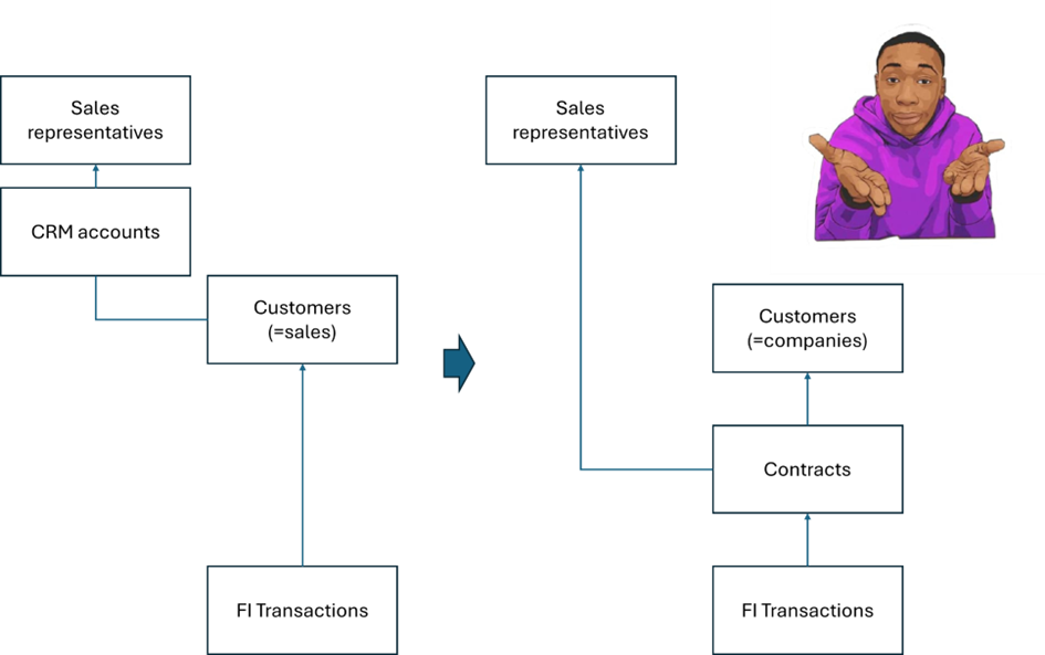 Another solution is just to say “there are contracts”. My MDM data will follow the reality as well as it can and my FI system has to track the association between the transactions/payments and the contracts signed by different sales representatives. That’s all, folks.
