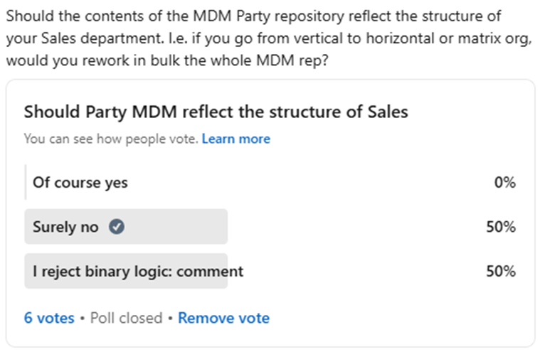 With 6 votes one cannot draw too many conclusions, but there is an interesting tendency – the Party repository is usually mostly represented by the “customer” data (in terms of volume), the clear source of the customer data is CRM, but it does not seem we have to go and blindly take this data.